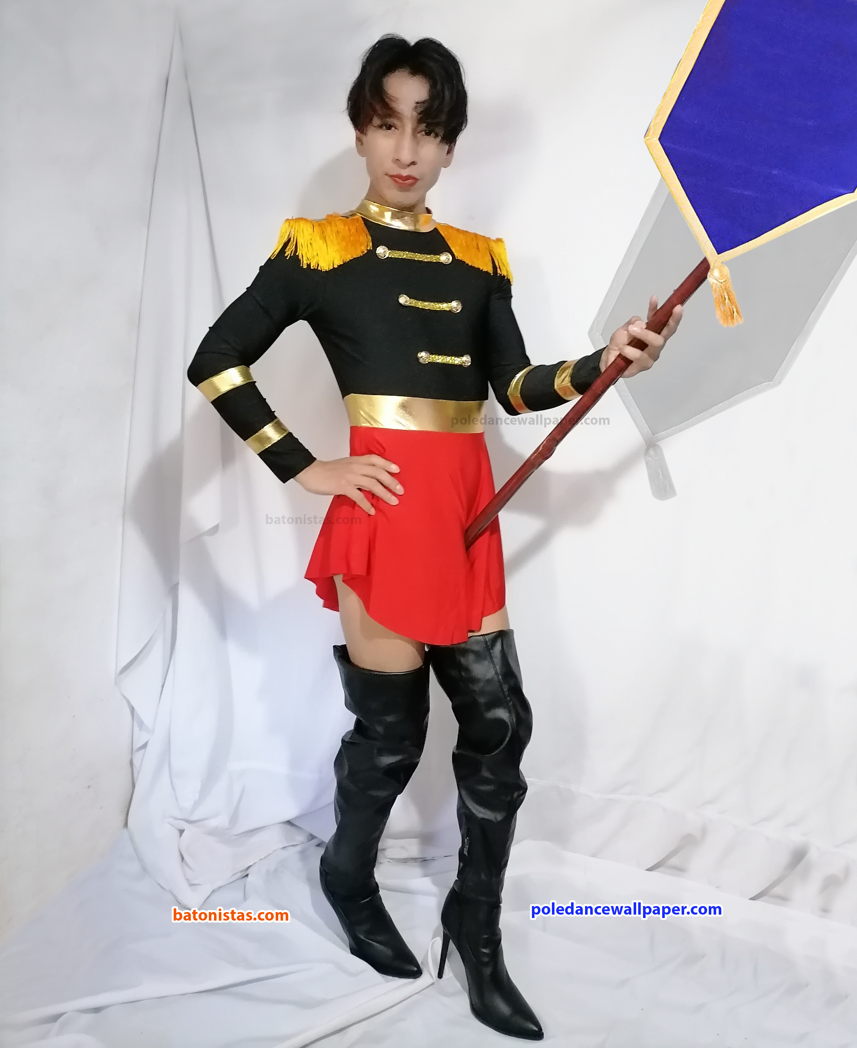 Con un look lleno de fuerza escénica y presencia, poso con un uniforme de batonista que combina detalles dorados, una falda roja vibrante y unas botas altas de tacón que aportan estilo y elegancia. El estandarte azul que sostengo en la mano es símbolo de disciplina y precisión, representando la pasión y el porte característico de los batonistas con banderas, una tradición llena de arte y carácter. 🔥✨